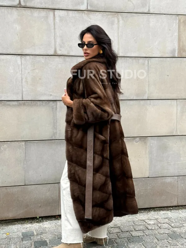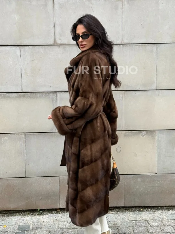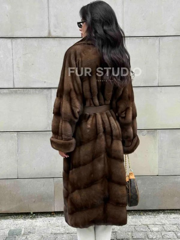 Мех данной шубы аукционная норка, цвет коричневый. Предлагается в размерах от 42 до 50 с 52 до 60 возможен отшив по индивидуальным параметрам. Длина модели 115-120 см, что выгодно подчеркивает фигуру девушек. Эта модель идеально подойдет для девушек и женщин, предпочитающих роскошные натуральные меха.