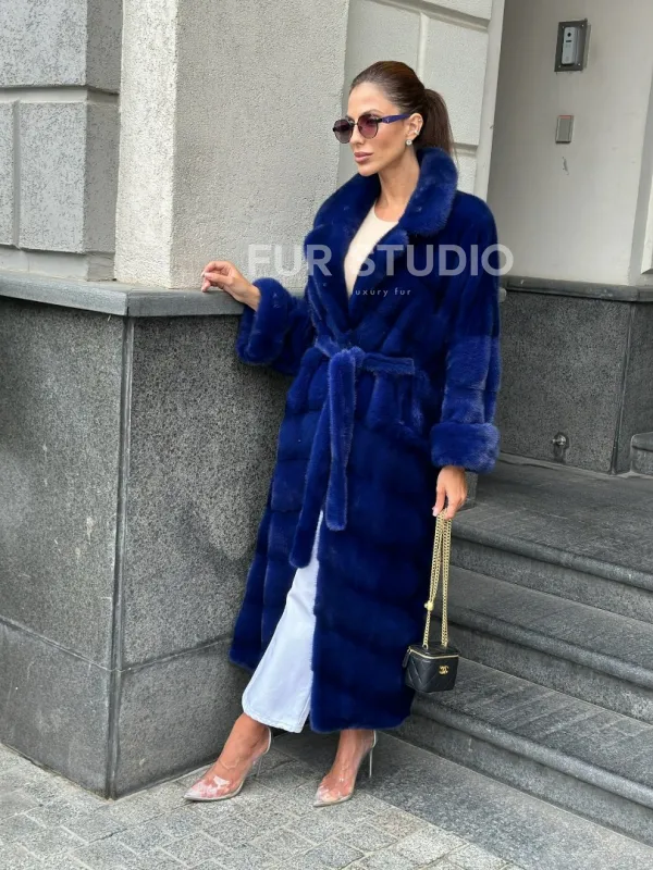 Мех данной шубы аукционная норка, цвет синий. Предлагается в размерах от 42 до 50. Длина модели 115-120 см, что выгодно подчеркивает фигуру девушек. Эта модель идеально подойдет для девушек и женщин, предпочитающих роскошные натуральные меха.