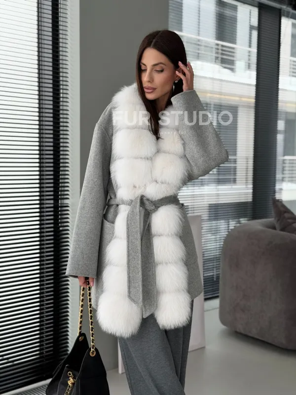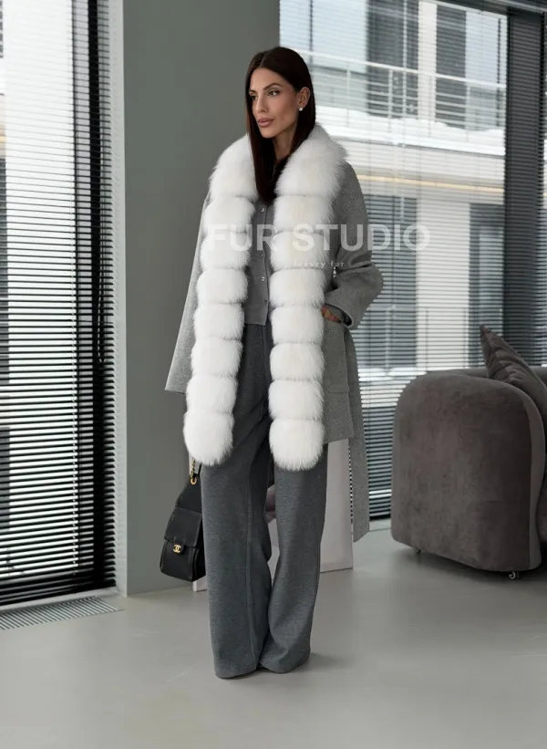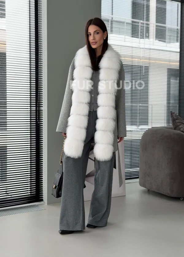 Серое пальто с меховым воротником 102909